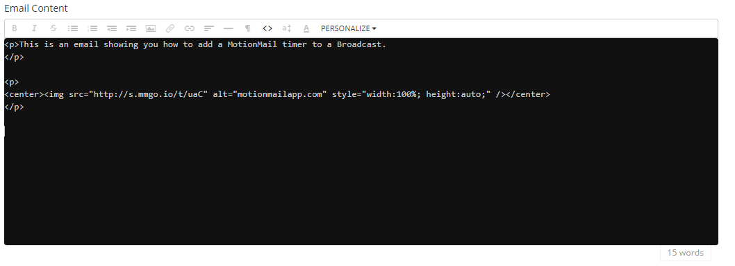 - Paste the embed code from your MotionMail Timer into the HTML. In the example below you will see I added <center></center> tags around the embed code to center it on the screen and also added style="width:100%; height:auto; to the embed code to make it mobile responsive: